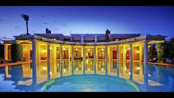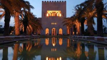 Autour de l’immense piscine, le parc planté d’oliviers, de rosiers blancs et d’espèces rares de palmiers et d’agaves est sillonné d’allées au détour