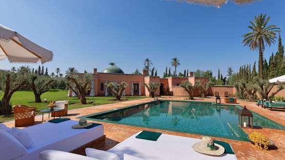 La piscine de la villa mesure 12,8 mètres. Elle est équipée de chaises longues et daybeds indiens. Une grande tente berbère est proposée dans le jardin; c’est un endroit merveilleux pour prendre un apéritif le soir. Il y a une terrasse surplombant la piscine ainsi qu’un salon / salle à manger intérieur avec cheminée et un beau plafond en forme de dôme.