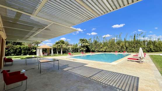 Au rez de chaussée on y retrouve de vastes espaces de réception, dont un salon marocain, un double salon européen avec deux cheminées, un grand espace de salle à manger pour 16 personnes.