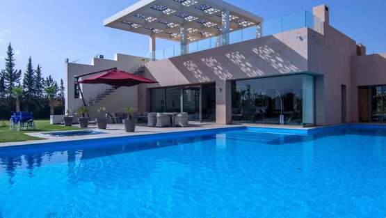 La villa, de plain-pied, offre une terrasse-toiture accessible, offrant une vue panoramique sur la majestueuse chaîne de l'Atlas.